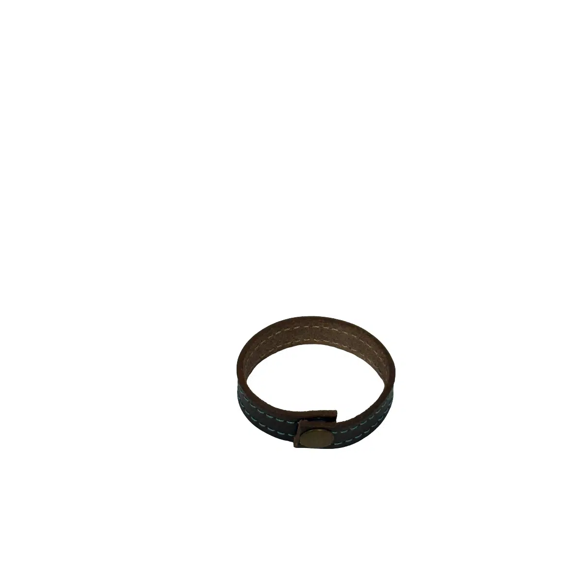 Bransoletka ze skóry w kolorze brązowym. Przeszycia niebieskie . Zapinana na napę.