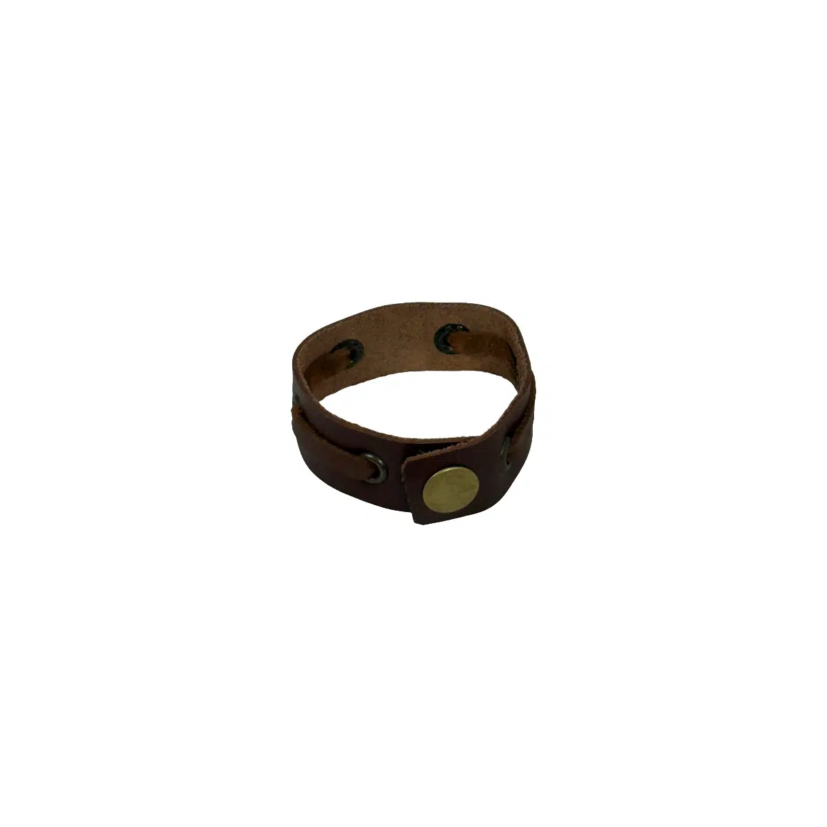 Bransoletka ze skóry w kolorze brązowym. Przeplatana rzemykiem . Zapinana na napę. Okucia i napa w kolorze oksydy.