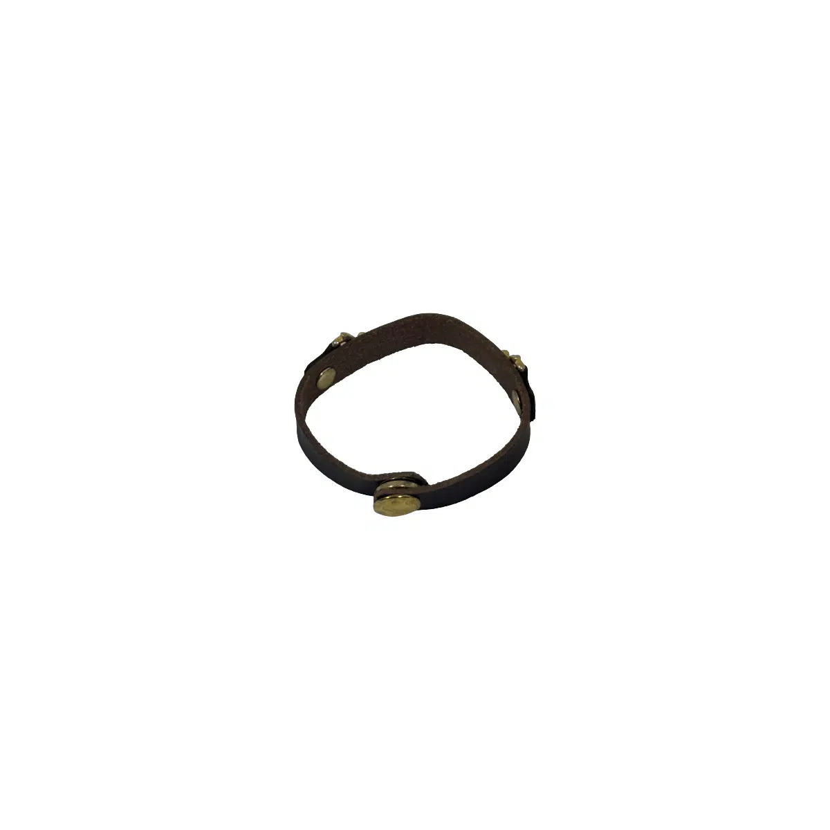Bransoletka ze skóry w kolorze brązowym. Zapinana na napę. Okucia i napa w kolorze złota.