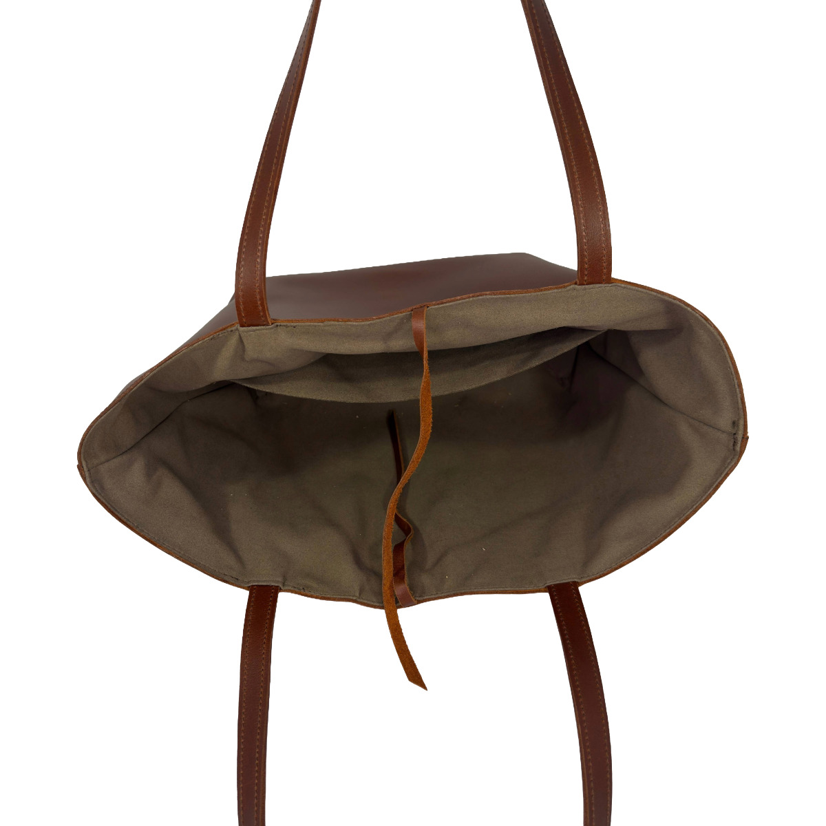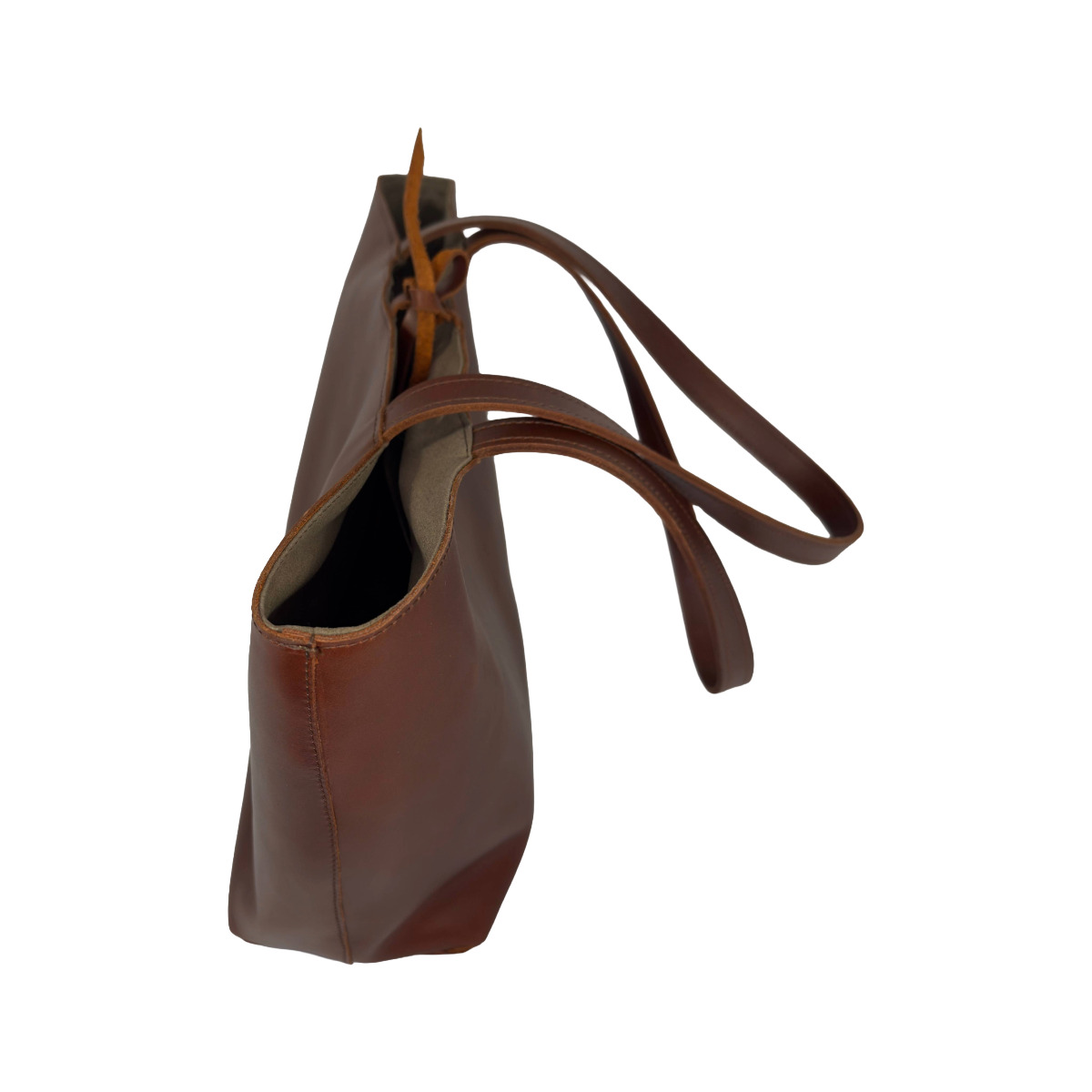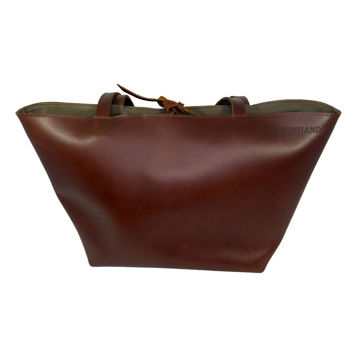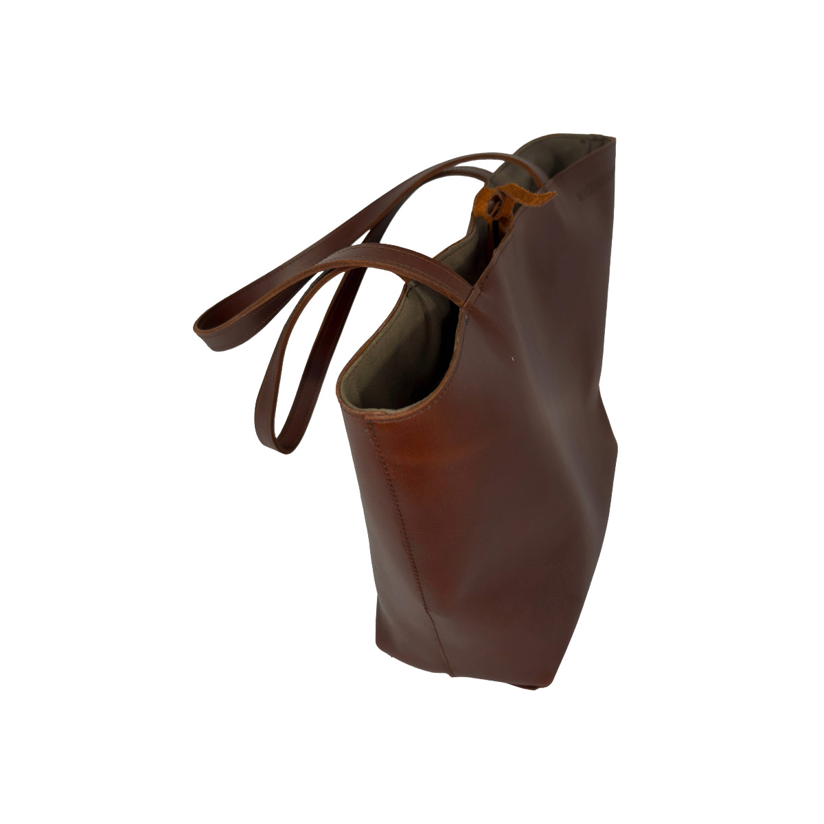 Piękna shopperka zamykana na rzemyk. Środek z wytrzymałego materiału jakim jest mikrofibra. Posiada osobną kieszonkę w środku. Na zewnątrz skóra licowa w kolorze brązowym. Wykonana w naszej pracowni. W tym kolorze posiadamy tylko 1 taki egzemplarz.
