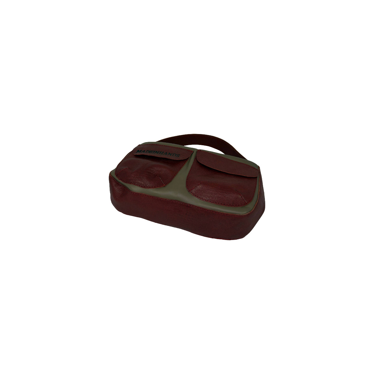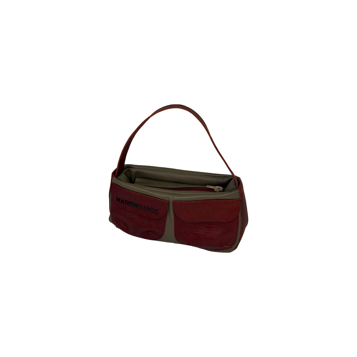 Mała fajna torebka na zamek. Z przodu torebki dwie małe kieszonki na drobiazgi. Połączenie dwóch skór. Całość w beżu. Rączka, kieszonki,boki i dół torebki to skóra bordowa tłoczona. Unikat. 1 egzemplarz wykonany w naszej pracowni.
