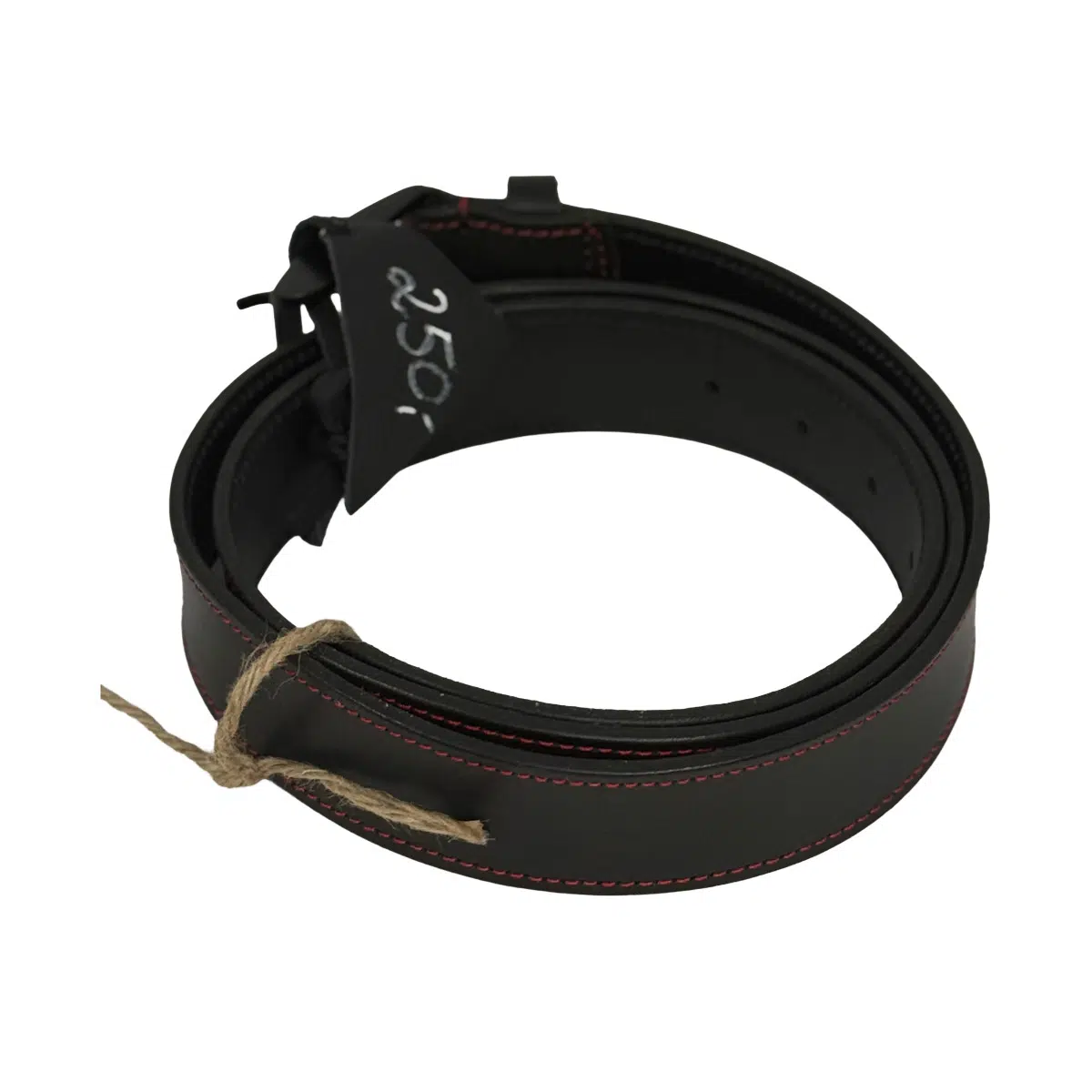 Męski skórzany pasek. Wykonany w naszej pracowni. Skóra w kolorze czarnym. Przeszycia w kolorze czerwonym. Świetna stylowa klamra w kolorze czarnym.
