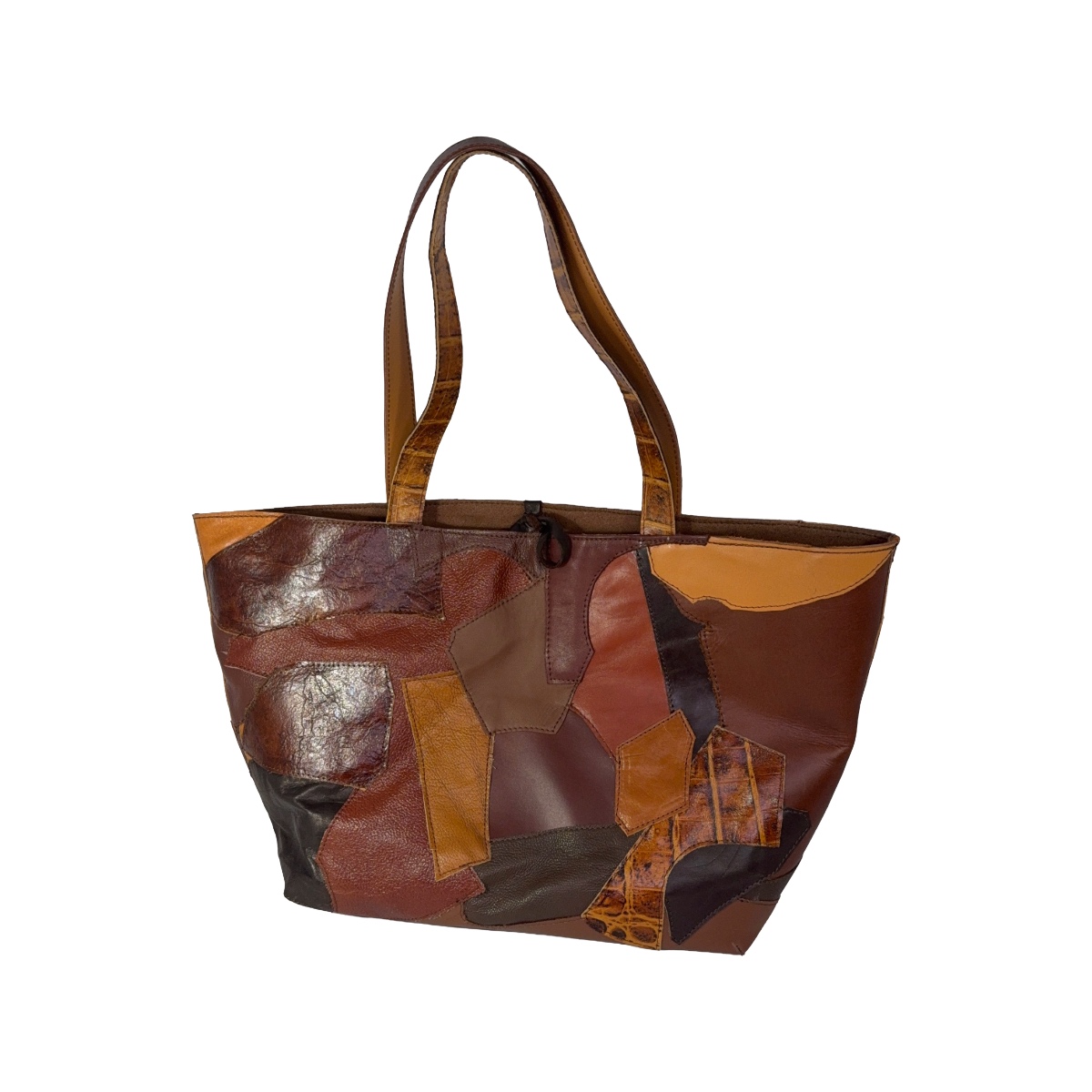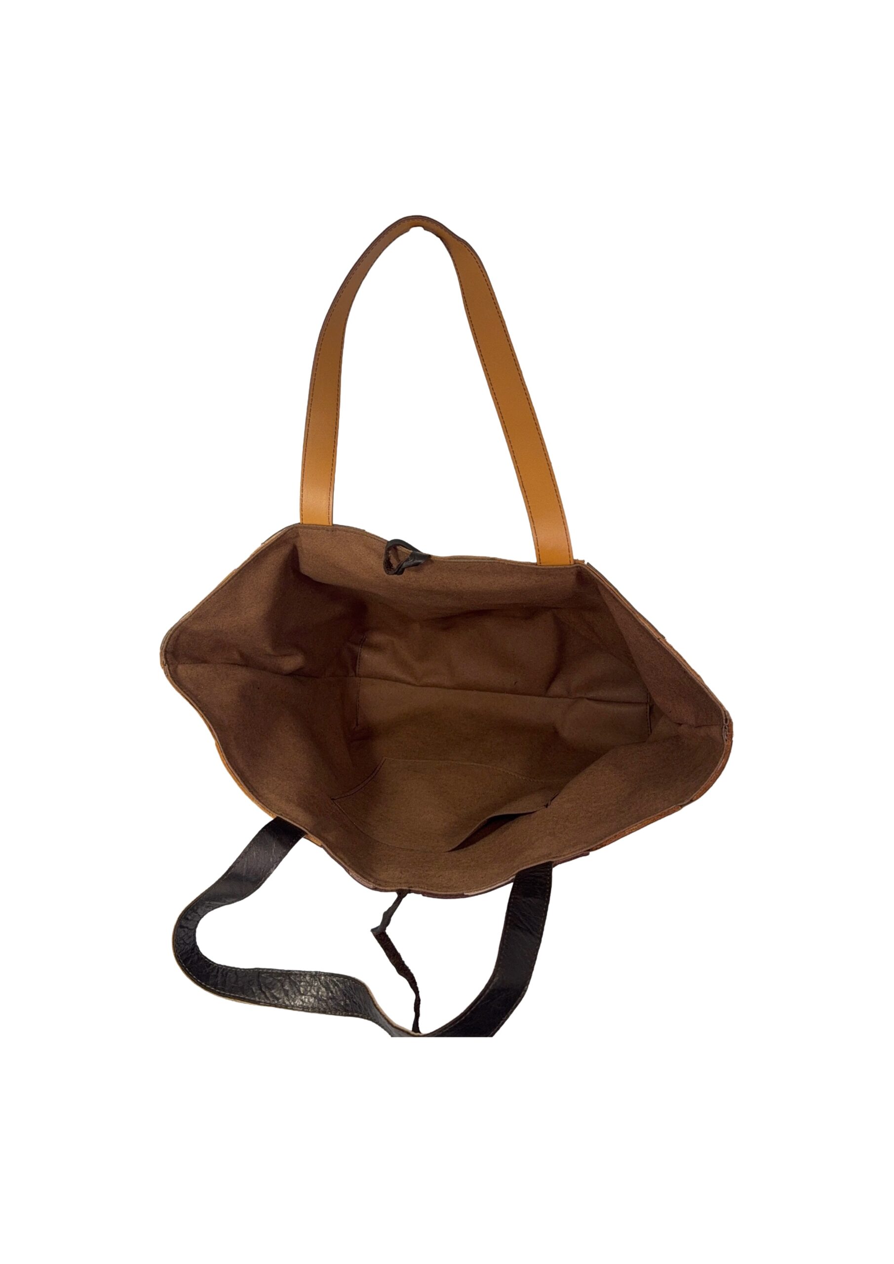Piękna shopperka zamykana na rzemyk. Środek z wytrzymałego materiału jakim jest mikrofibra. Posiada osobną kieszonkę w środku. Na zewnątrz skóry licowe w tonacji brązowej. Wykonana w naszej pracowni. Metoda Zero Waste. W tym kolorze posiadamy tylko 1 taki egzemplarz.